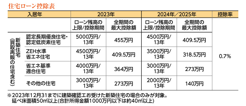 ローンを借りて住宅を取得すると、年末のローン残高の0.7%相当額が所得税・住民税〈所得税額から控除しきれない額は、所得税の課税所得金額等の5%(上限97,500円)の範囲内で住民税から控除される〉から一定期間控除される制度があります。ローン返済期間10年以上、合計所得金額2,000万円以下の人が対象。ローン残高の限度額や控除期間は下の表の様に住宅や入居年によって異なります。