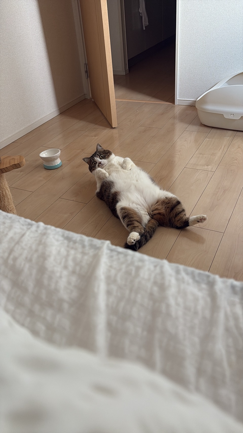 みそは床で大胆にひっくり返りながらこちらをガン見。