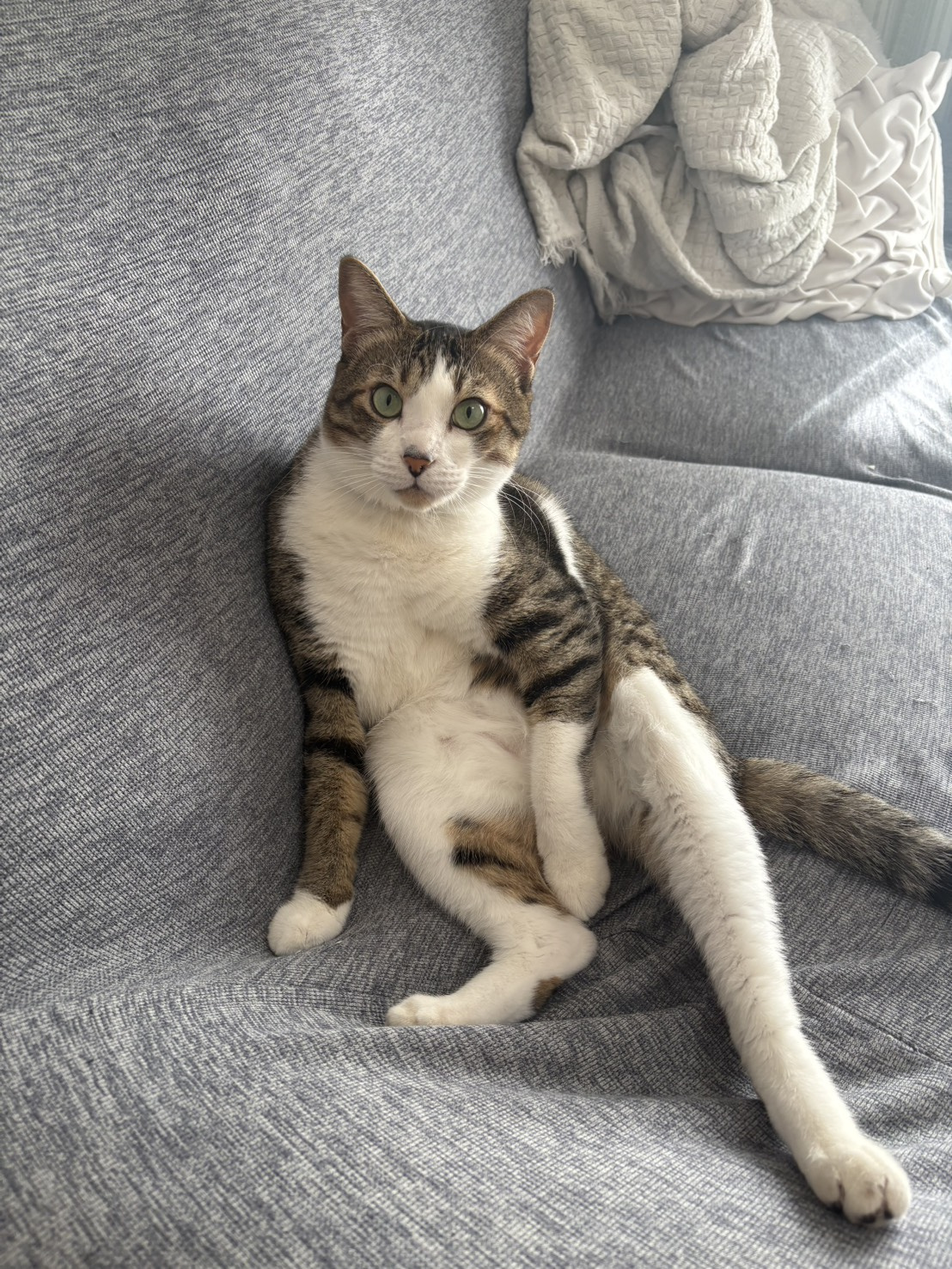 なぜか “人間みたいな座り方” を極めはじめているソル君、ソファでこんな姿勢に